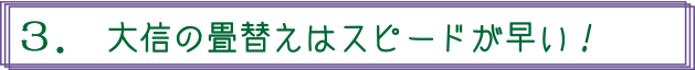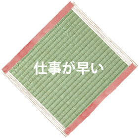 | 配達専門の職人と畳加工仕上げ専門の職人とがそれぞれ分かれておりますので、当日仕上げが可能。地域によっては半日仕上げも可能です。もちろん配達時間の指定も出来ますので、引き上げの時と敷き込みの時だけ自宅に居て下されば大丈夫です。作業の目安時間は家具の無い和室であれば約15分程度で済みます。ですので一日に複数のお宅・複数の和室に伺います。(30枚位でしたら一日仕上げ可能です) |